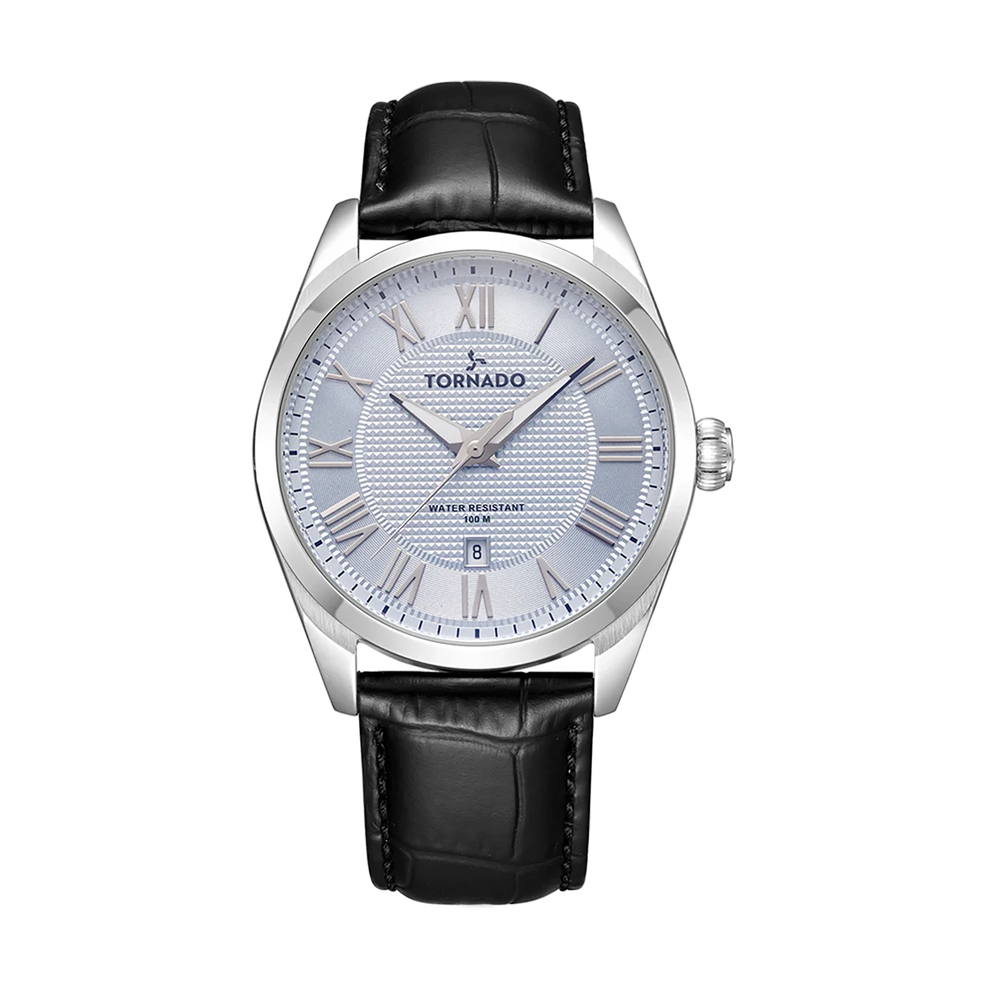 Tornado Celestia Classic's Analog Watch with blue dial, silver case, black leather strap. Japan Quartz movement, slight dome sapphire coated glass, 10ATM water resistant. 3-year warranty included.