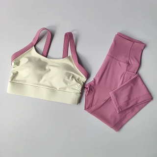 طقم يوغا عالي الكثافة مصمم للراحة والأداء الأمثل. يتألف الطقم من قطعتين: حمالة صدر رياضية أنيقة بتصميم متقاطع الظهر وألوان متداخلة، وبنطال ضيق عالي الخصر لرفع الأرداف وإبراز منحنياتك الطبيعية. يضمن التصميم الانسيابي ملاءمة مريحة وسلسة خلال كل تمرين.